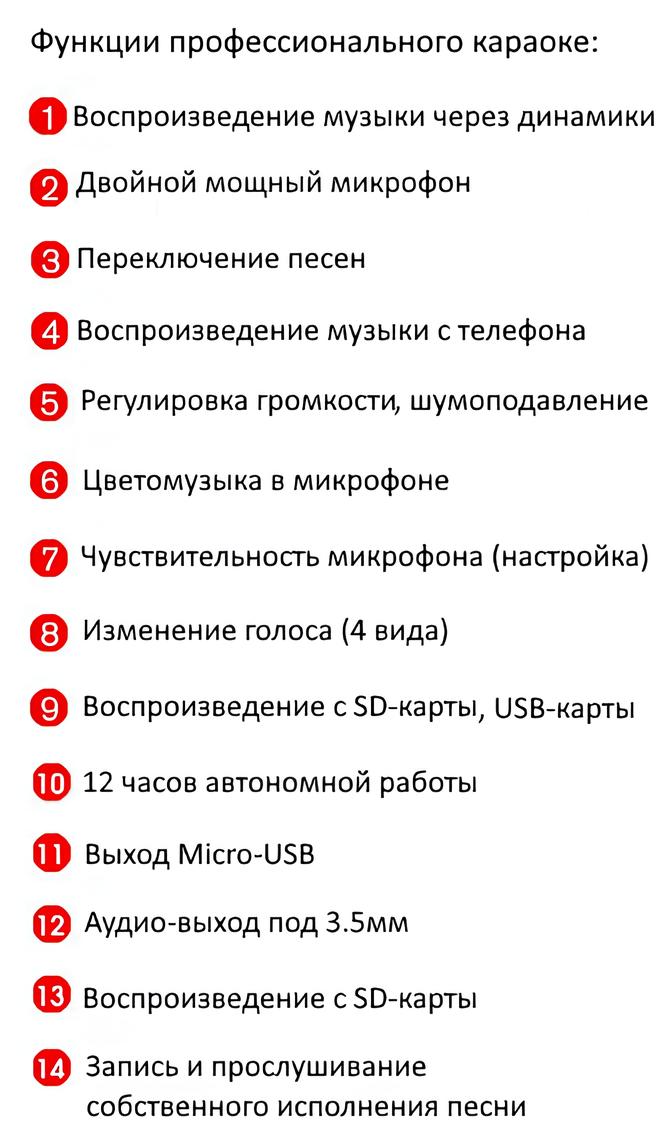 Домашнее караоке скрасит собой ваш праздник, день рождения и Новый год: дома, в гостях, на репетициях певцов, корпоративах; с родными и друзьями, на природе, даче и в загородном доме! Придется по вкусу и подарит удовольствие даже самым взыскательным певцам! Уникальное караоке так же устройство идеально подойдет на вечеринка и дискотеках!